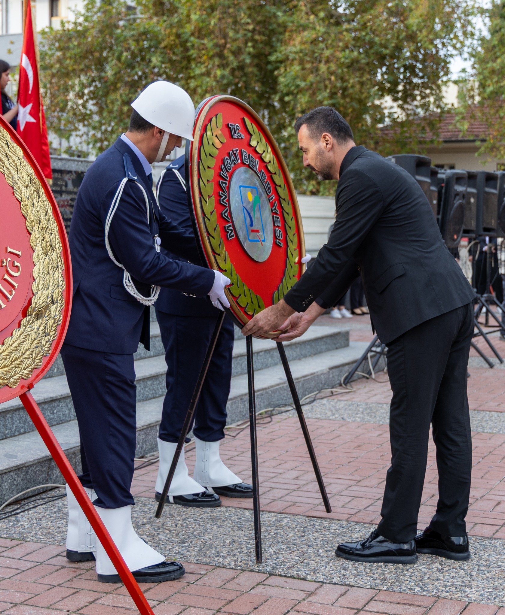 Anma töreni, Atatürk Anıtına çelenk sunumuyla başladı. Törende Manavgat Kaymakamı Adil Karataş, Manavgat Belediye Başkan Vekili Mehmet Çiçek  ve Garnizon Komutanı Albay Nizamettin Alp tarafından Atatürk Anıtı’na çelenk sunuldu.  Çelenklerinin sunulmasının ardından saat 09.05'te sirenler eşliğinde iki dakikalık saygı duruşunda bulunuldu. Tören, bayrağın yarıya indirilmesi ve İstiklal Marşı'nın okunmasıyla sona erdi.