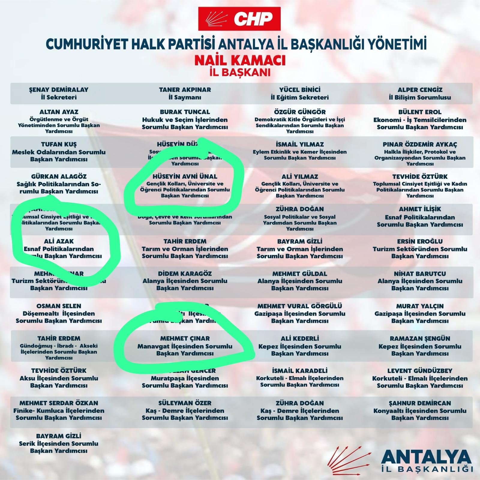 Buna göre; Hüseyin Avni Ünal Gençlik Kolları, Üniversite ve Öğrenci Politikalarından Sorumlu, Ali Azak, Esnaf Politikalarından Sorumlu ve Mehmet Çınar, Manavgat ilçesinden Sorumlu başkan yardımcılıkları görevine getirildi.