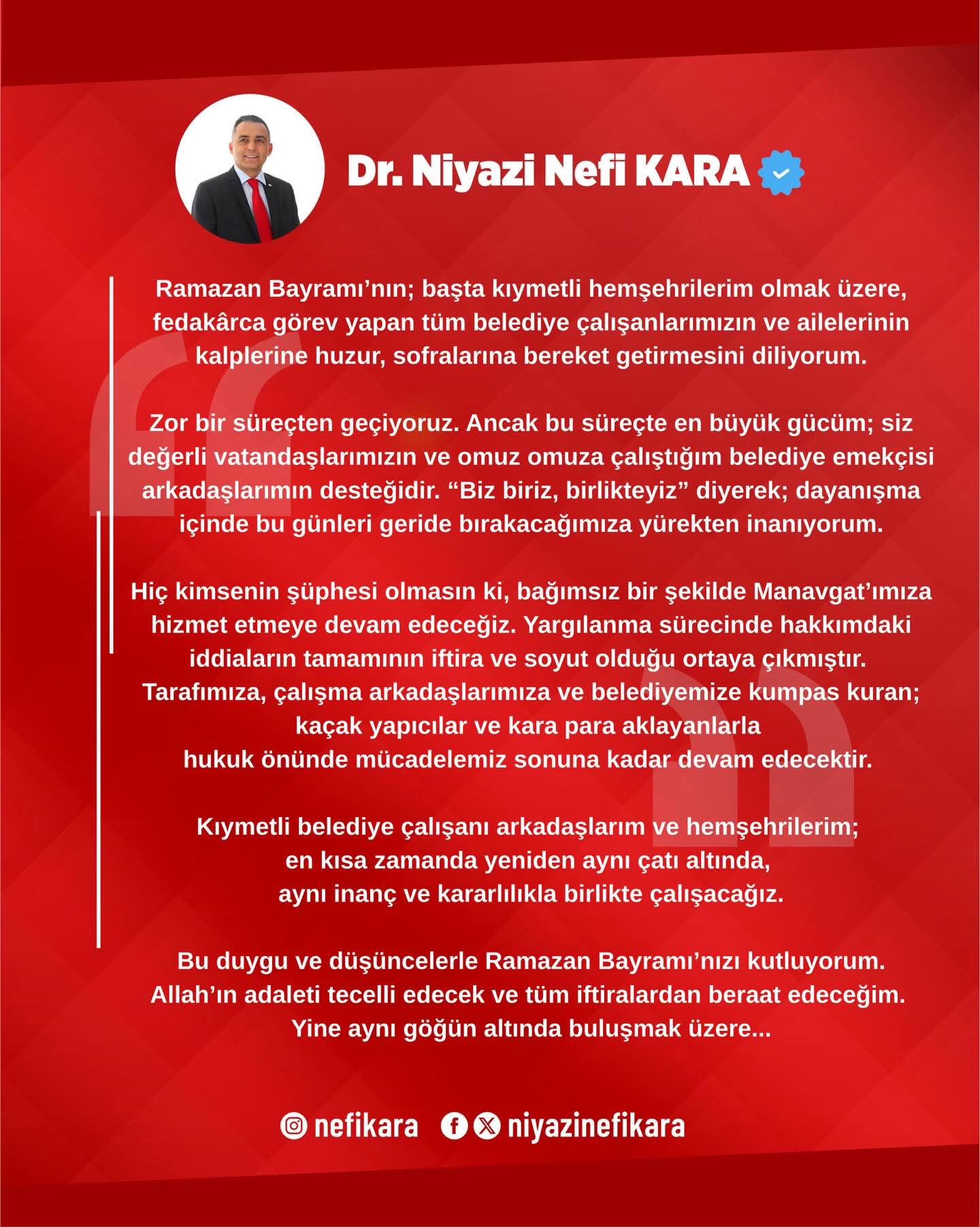 Bayramın bereket getirmesini dileyen Başkan Niyazi Nefi Kara, soruşturma sürecine de değindiği mesajında; “ Hiç kimsenin şüphesi olmasın ki, bağımsız bir şekilde Manavgat’ımıza hizmet etmeye devam edeceğiz. Kıymetli belediye çalışanı arkadaşlarım ve hemşehrilerim; en kısa zamanda yeniden aynı çatı altında, aynı inanç ve kararlılıkla birlikte çalışacağız. Bu duygu ve düşüncelerle Ramazan Bayramı’nızı kutluyorum. Allah’ın adaleti tecelli edecek ve tüm iftiralardan beraat edeceğim. Yine aynı göğün altında buluşmak üzere…” ifadelerine yer verdi.