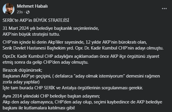 Mehmet Habalı, “Serik’te AKP’nin Büyük Stratejisi’ başlığıyla sosyal medya hesabından yaptığı paylaşımında; 2019 yerel seçimine de atıfta bulunarak “ 2019’da da strateji aynıydı. CHP ve İYİ Parti’nin ortak adayı da yine AKP’den getirilmişti” diye yazdı. (*)